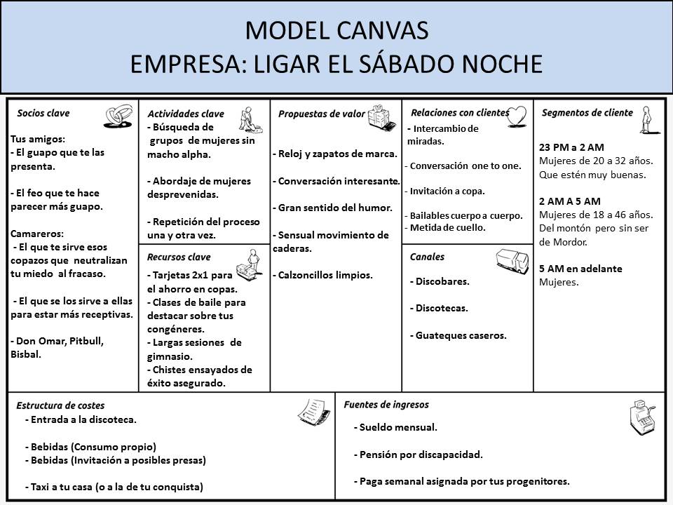 Y como no hay mayor empresa que vivir el día a día, y al grito de ¡Model Canvas es Dios! me complace anunciar que ésta, la primera entrada de mi blog «Sangre, sudor y marketing» no es otra cosa que un Canvas aplicado a una de las más complejas empresas a las que un joven actual puede enfrentarse en su vida: alternar un sábado noche para encontrar a la chica de sus sueños.